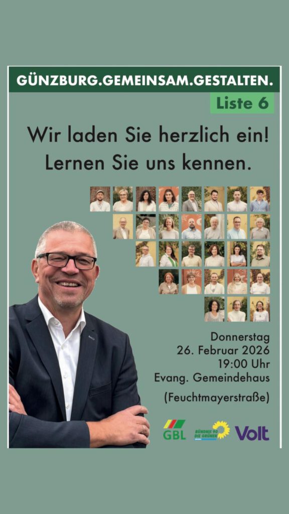 Die Ortsgruppe Günzburg freut sich bekanntzugeben, dass nach einer längeren Zeit der Gespräche Volt zusammen mit der Günzburger Bürgerliste (GBL) und den Grünen zur anstehenden Kommunalwahl 2026 auf einer gemeinsamen Liste antreten wird.